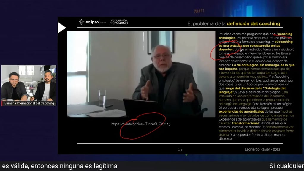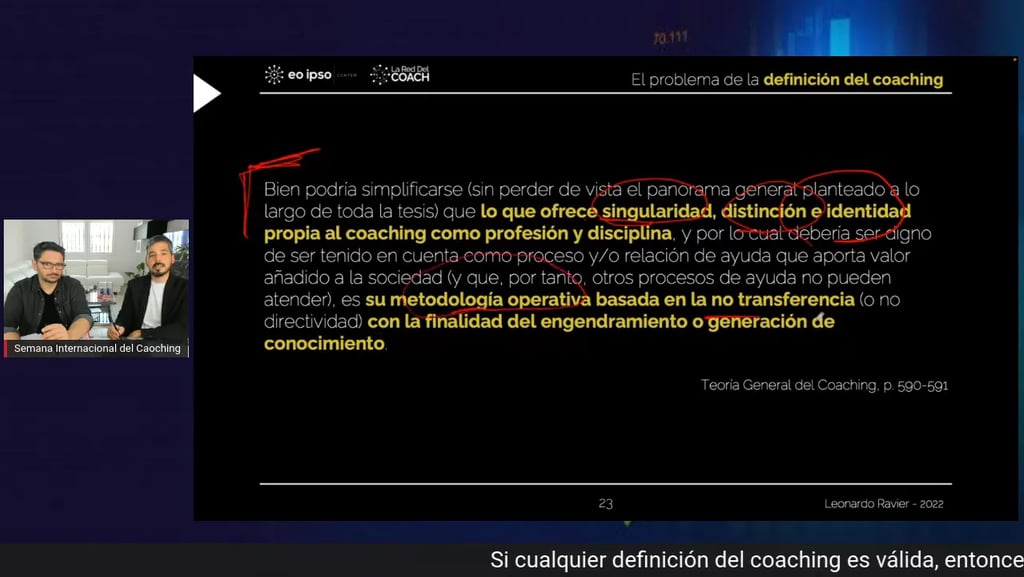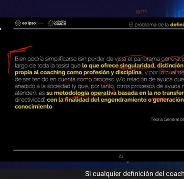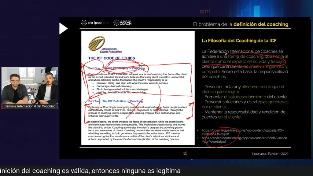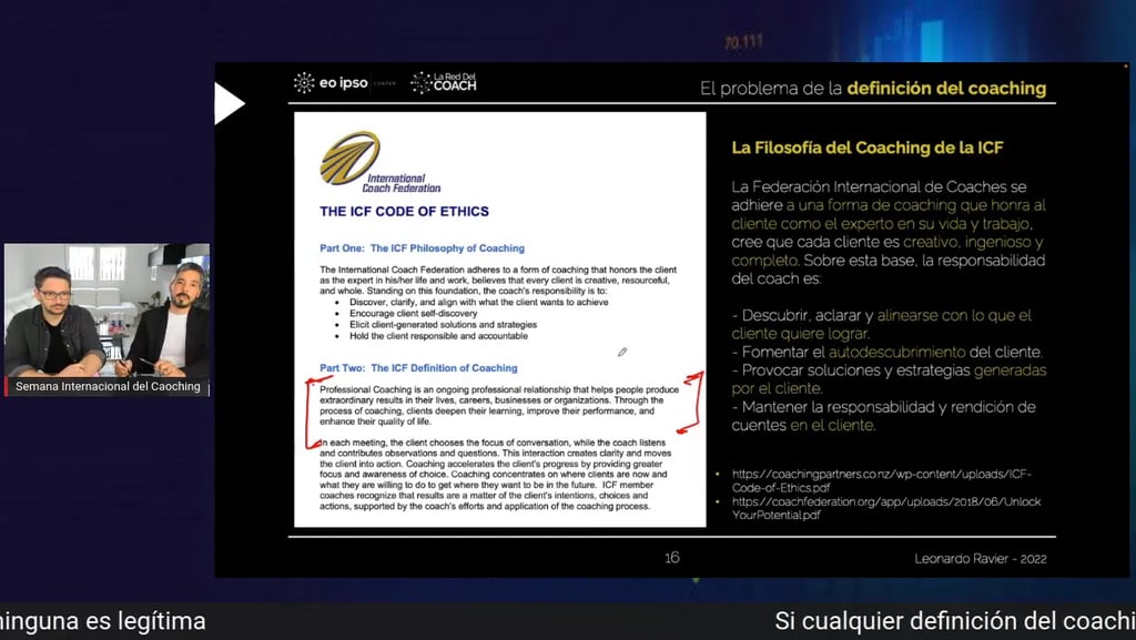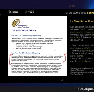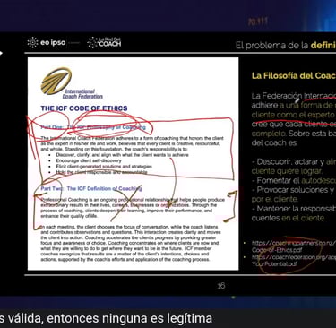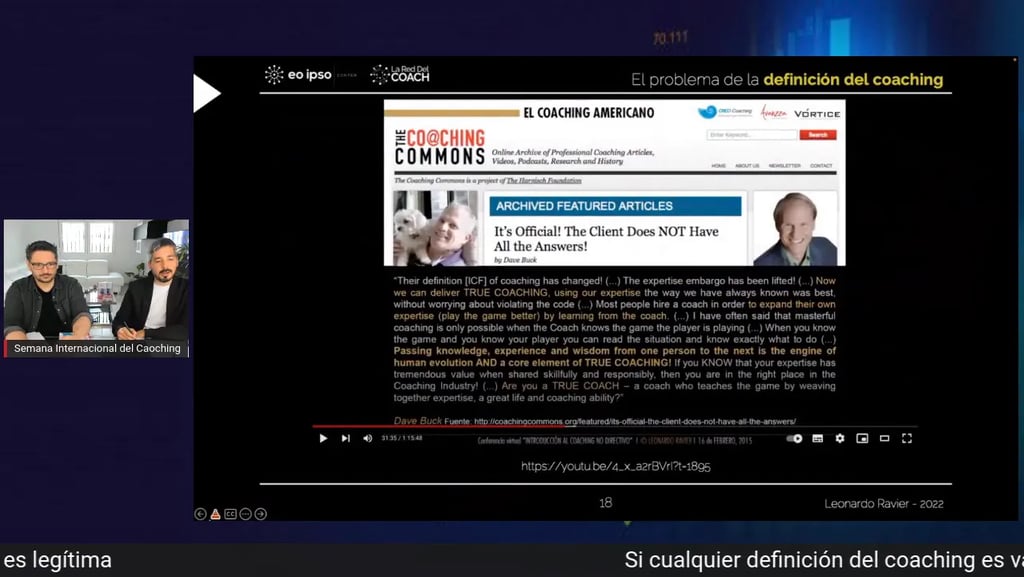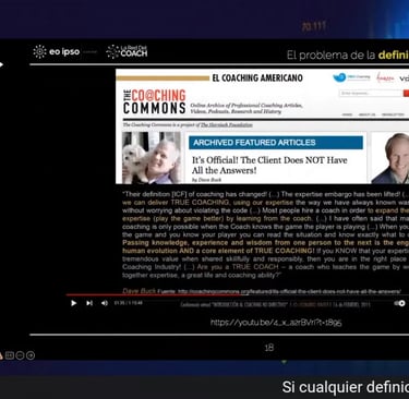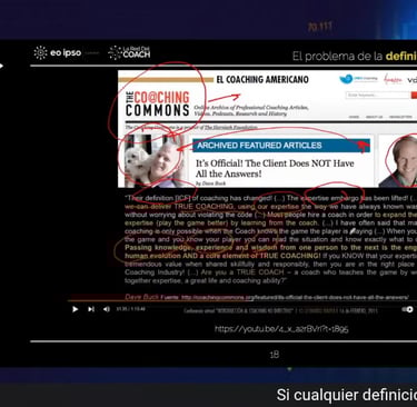 Uno de los pasajes más reveladores del vídeo es el cambio en la definición de la ICF, donde sectores del mercado celebran que se haya retirado la limitación sobre compartir experiencia. Se afirma que se ha levantado el «embargo» a transferir conocimiento o sabiduría, y que gracias a ello «ya se puede hacer verdadero coaching».